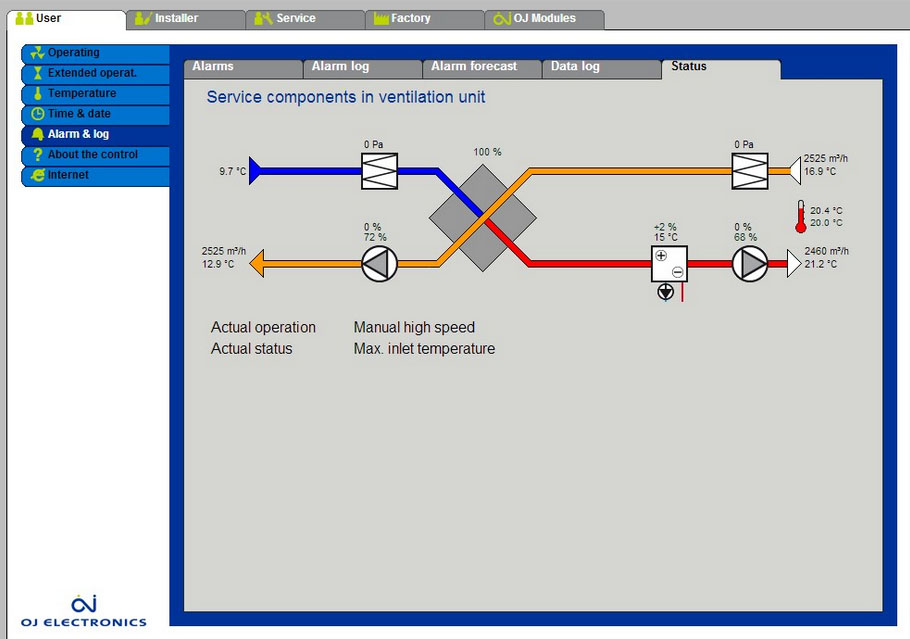 Een duidelijk helder overzicht van de unit is ook voor de eindgebruiker beschikbaar. Alle gegevens staan erin vermeld: luchtdebiet, temperaturen, uitsturing ventilatoren, setpoint instelling, stand van de bypassklep, actuele status van de gecombineerde koeler/verwarmer (change over). Ook het actuele drukverlies over de filters is beschikbaar, mits deze optie is opgenomen in de unit.